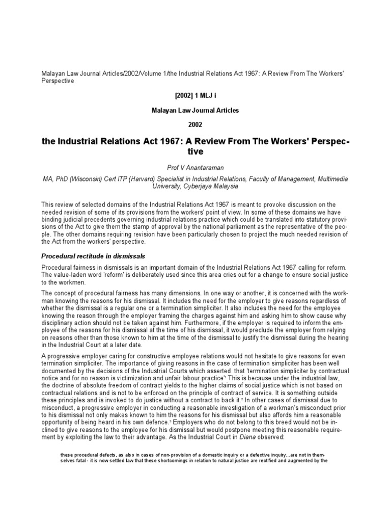 Related : Industrial Relations Act 1967 / Industrial relations act 1967 as a whole to determine its policy and object, raja azlan shah cj stated that, it cannot be denied that the intention of the act is to regulate the relations between management and labour and to prevent and settle trade disputes arising therefrom..